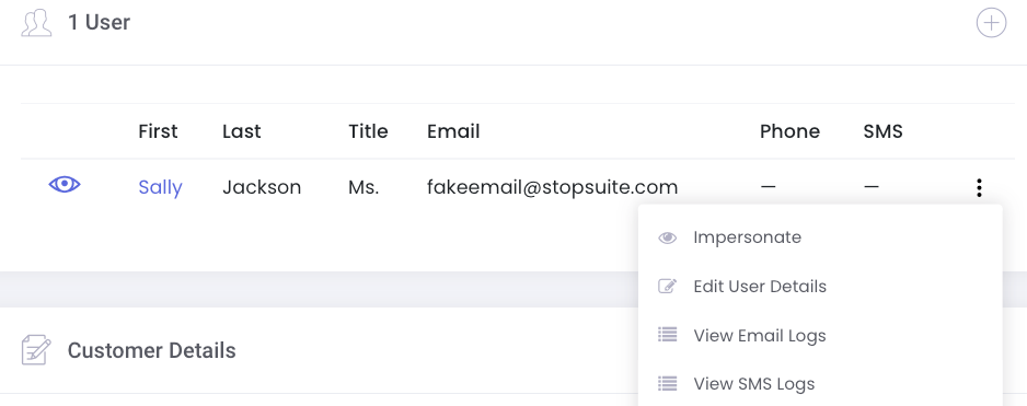 To quickly view email and SMS logs for a particular customer, go to their customer detail page and scroll down to their users. Click the three dots and then View Email Logs or View SMS Logs: