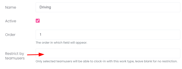You can now restrict work types by team users. This is helpful if you use the clock-in/clock-out feature on the driver app and have multiple work types that don't apply to all team users. To enable this setting, go to Team > Work Types. Edit a work type and enter the team users in the restrict by field:
