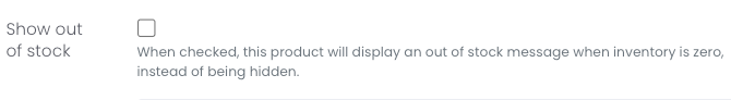 On the product level, you can now enable a show out of stock badge in place of the Add to Cart button. When this setting is turned on, the product will not disappear from the shop when inventory reaches zero.